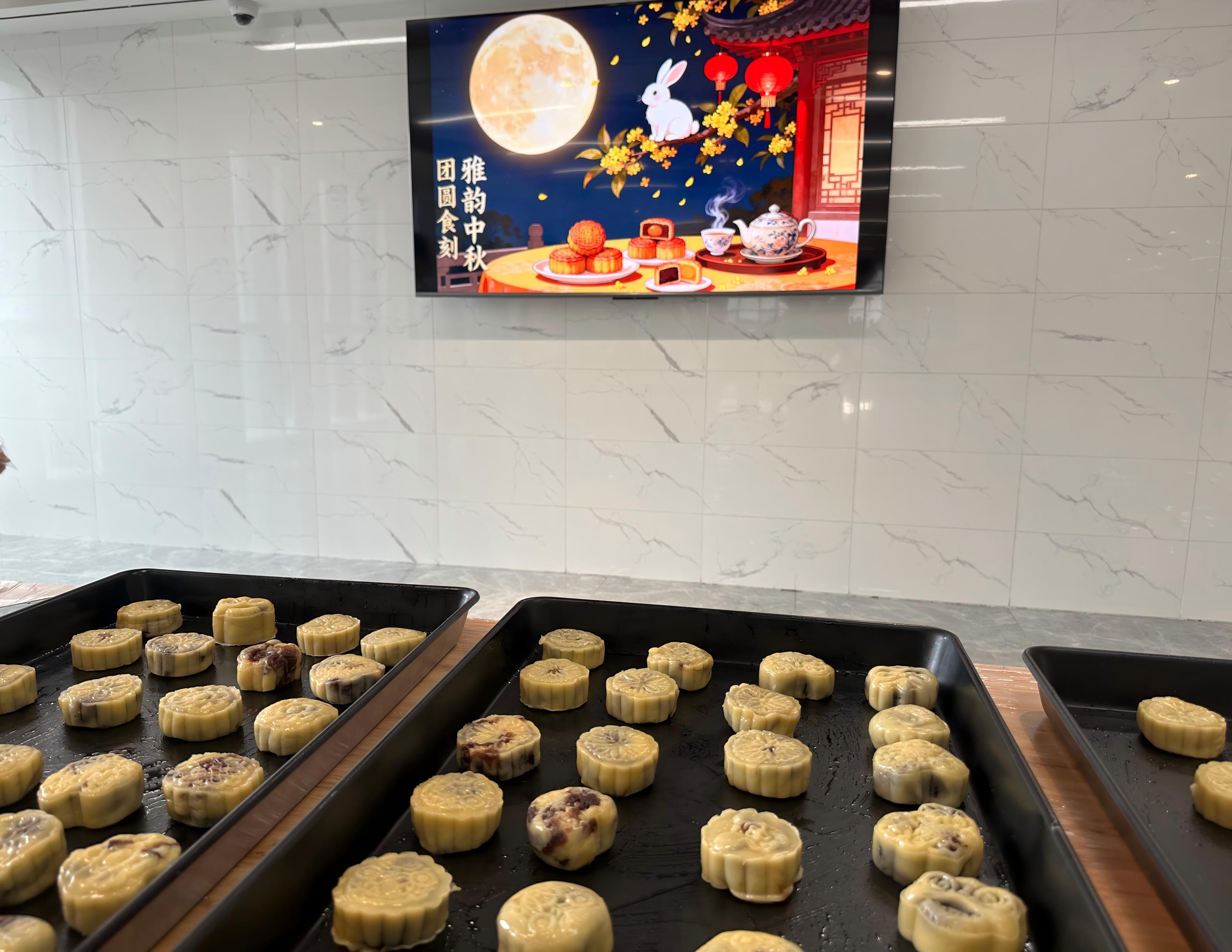 活動現(xiàn)場布置得溫馨雅致,面團(tuán)、餡料、模具等材料早已備好,各處充滿了濃厚的節(jié)日氣息。在面點(diǎn)師傅的指導(dǎo)下,大家興致勃勃地投入到月餅制作中,揉搓面團(tuán)、包入餡料、放入模具……同事們互相交流技巧,分享心得,一個(gè)個(gè)飽滿可愛的月餅在手中成型。
